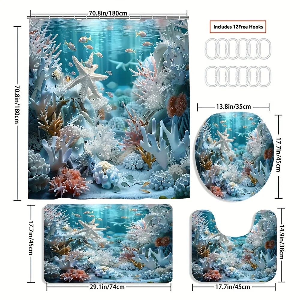 Enchanting Underwater Coral Reef Bathroom Set - Waterproof Shower Curtain, Toilet Lid Cover, Bath Mat, and Contour Mat