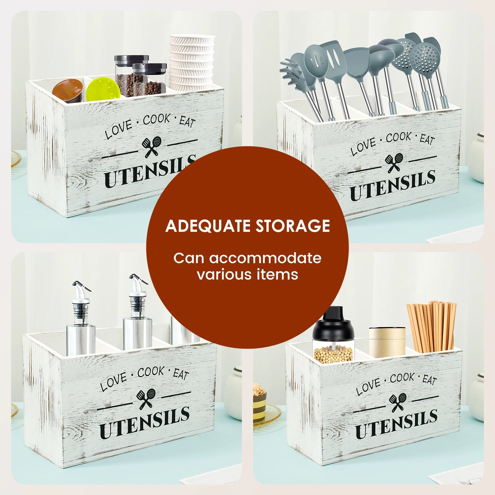 Kitchen Countertop Organizer and Cooking Tools Storage Wooden Kitchen Utensil Holder 3 Compartments Sturdy Silverware Holder