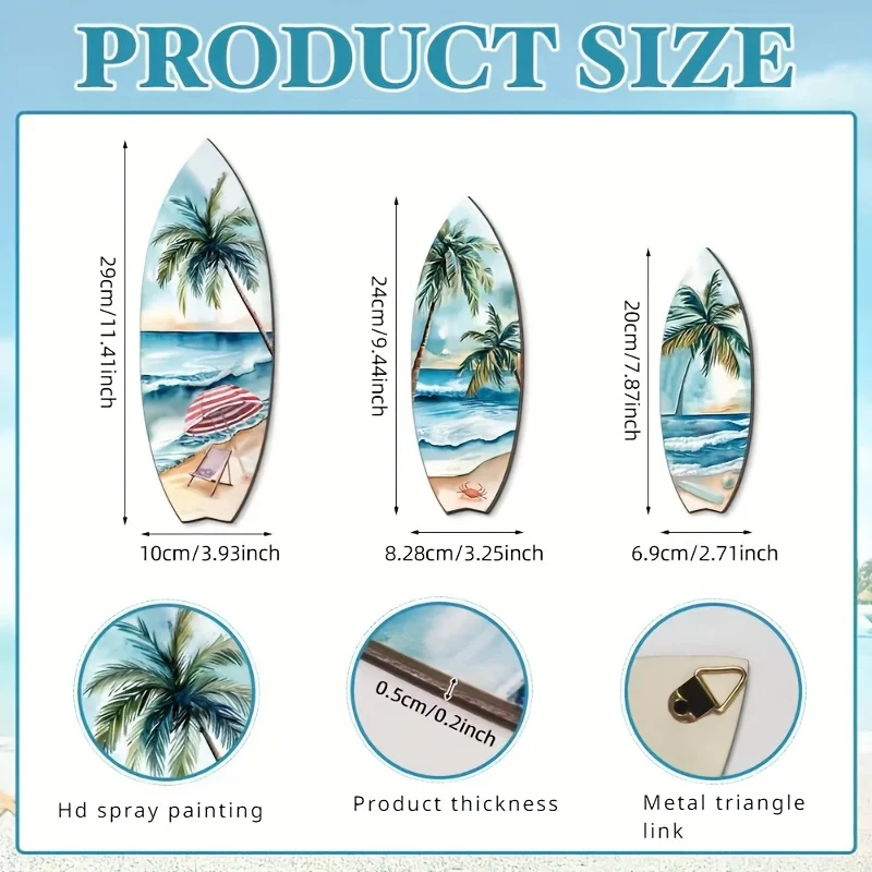Set of 3 Handcrafted Wooden Surfboard Wall Decor - Coastal Beach Themed Hanging Plaques for Summer Home & Patio Design