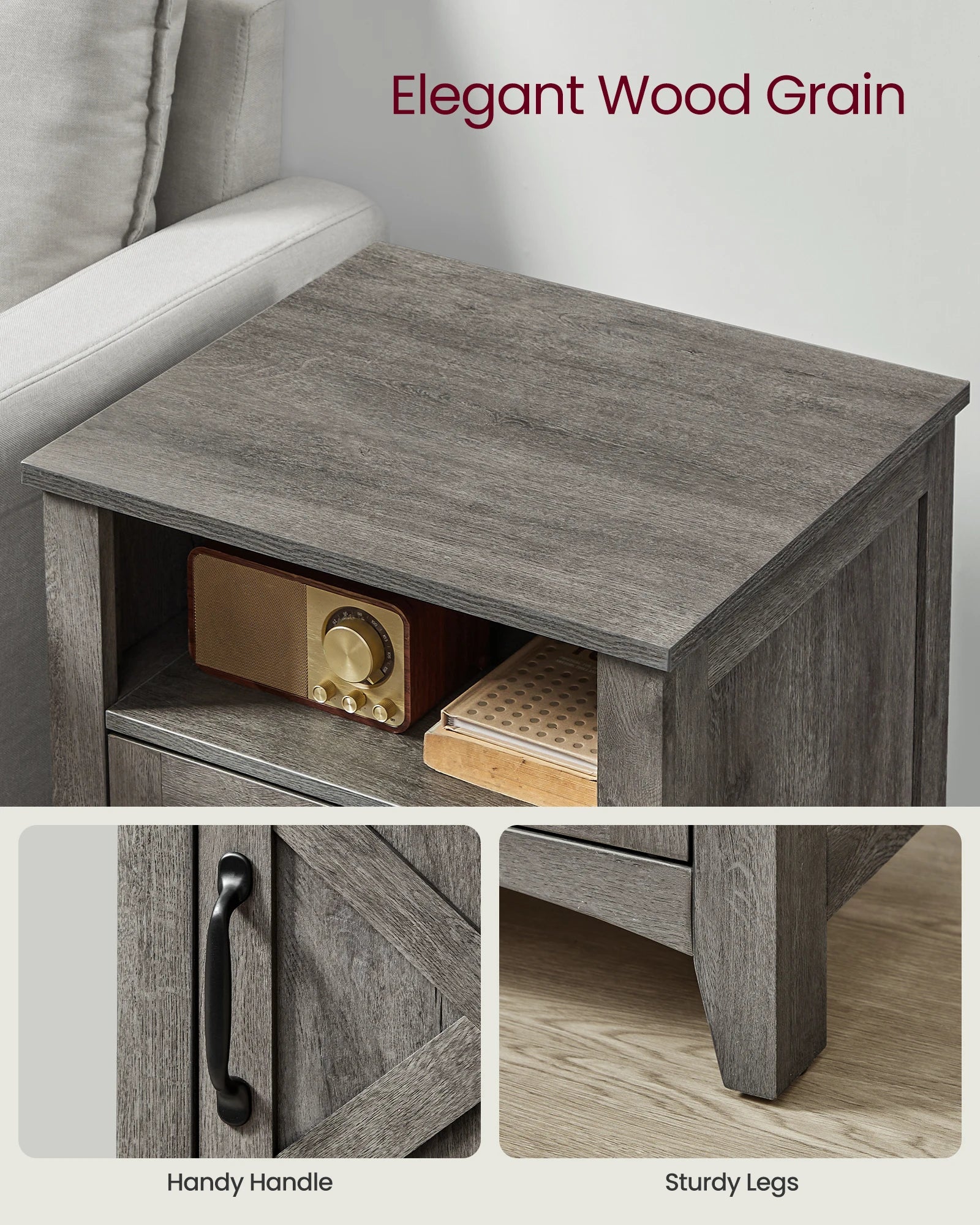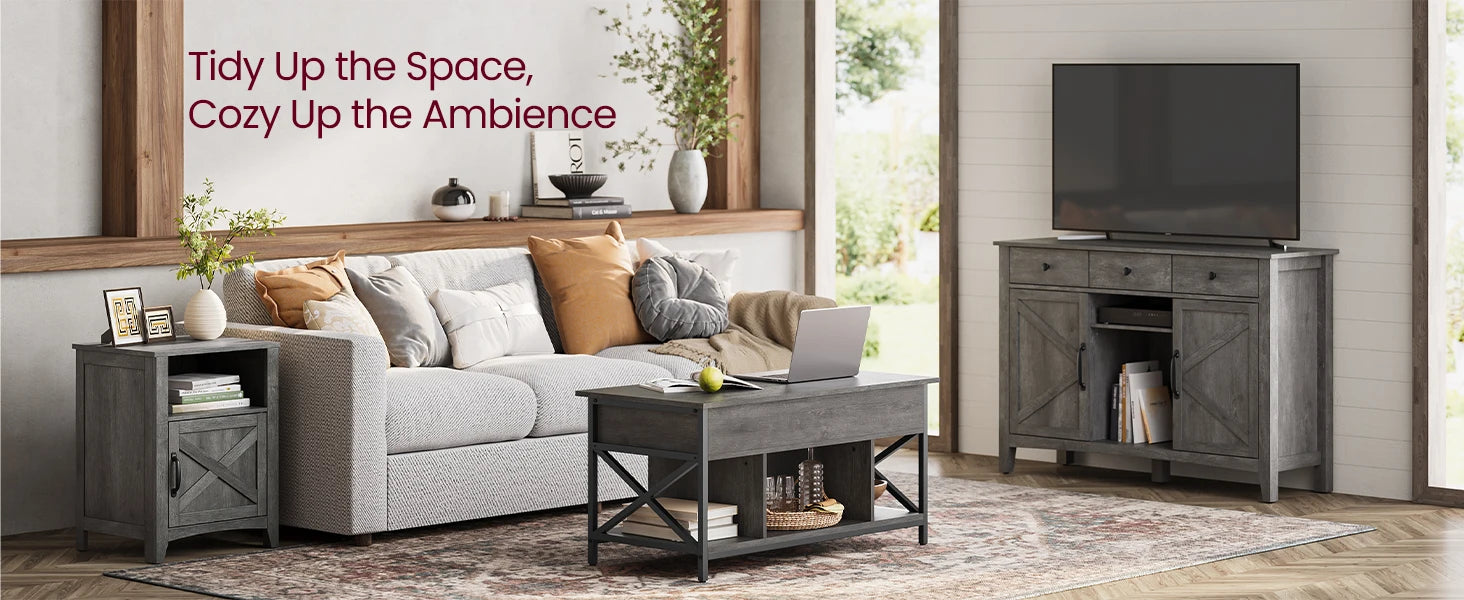 [Versatile All-Rounder] Imbued with rustic hues and the charm of a barn door, these tables bring farmhouse elegance to your space. Their versatility shines as nightstands in the bedroom, side tables, or coffee tables in the living room