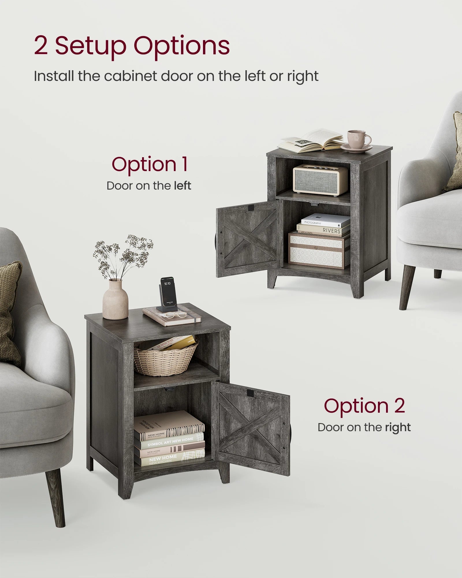 [Door on the Right or Left] You can set up the cabinet door to open from the left or right based on your room layout or personal comfort. Whether you're right or left-handed, or dealing with room constraints, this design offers you optimal convenience